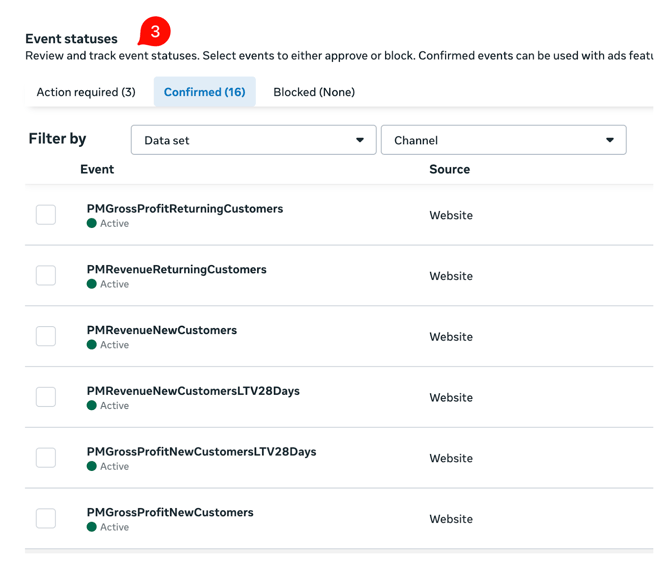 Then you will see the list of events we send to Meta. In total, there are eight custom events: four based on profit and four based on revenue. Please click this link to learn how to use them and tailor them for bidding inside Ads Manager.