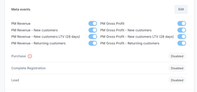 - In the example above, standard events (Purchase, Complete Registration, Lead) are disabled, while the custom events are enabled, but your setup might be different.