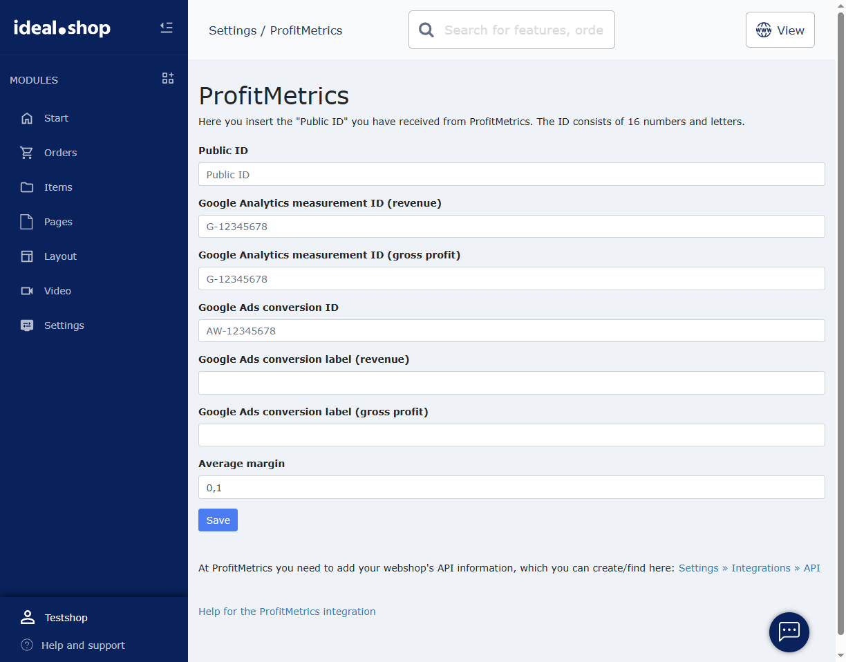 - In your ideal.shop administration, go to Settings > Integrations > ProfitMetrics.