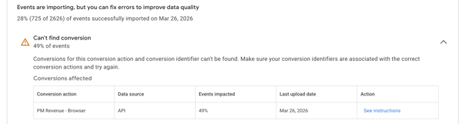 When a conversion occurs, ProfitMetrics first attempts to match it against the PM Revenue/Gross Profit Browser conversion actions. If the order was not originally tracked by the browser conversion action, the API update call returns an error. This error is expected — it tells the system to route the conversion to the PM Revenue/Gross Profit Booster conversion action instead. Google Ads surfaces these expected errors as warnings.